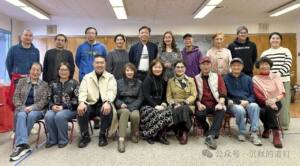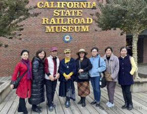 上图:出品人陈建萍(左四)和《沉默的道钉》剧组导演主演等在加州铁路博物馆了解华工历史。